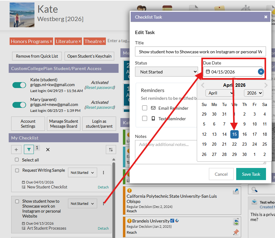 "Complete by" dates, aka Due Dates, are added on My Checklist on the student profile so that you may customize the date as it relates to each student. You may add the date as you create the individualized student checklist or at a later time. You may also add alerts to remind you of the "Complete by" date. For more information, see "How do I set up alerts for items on "My Checklists"?