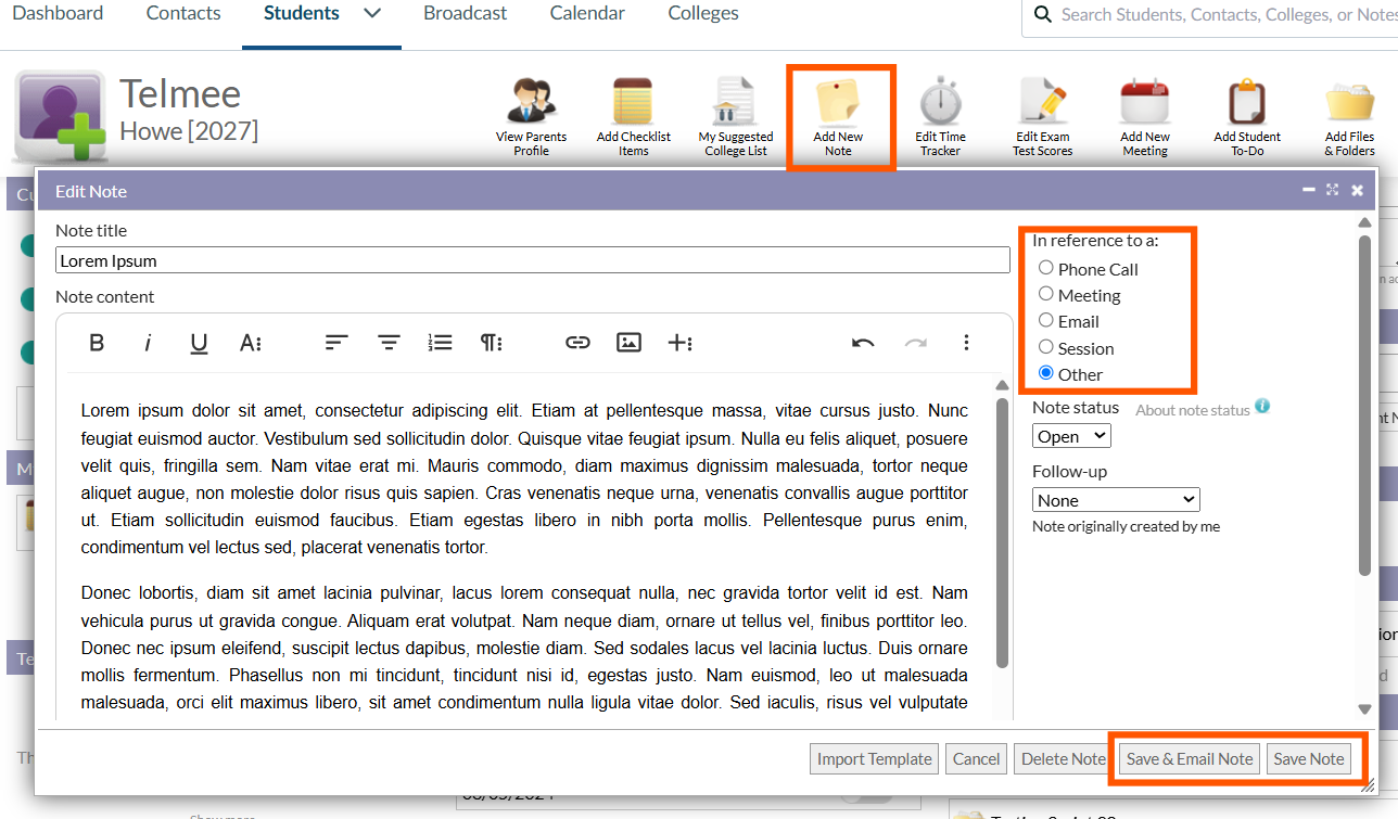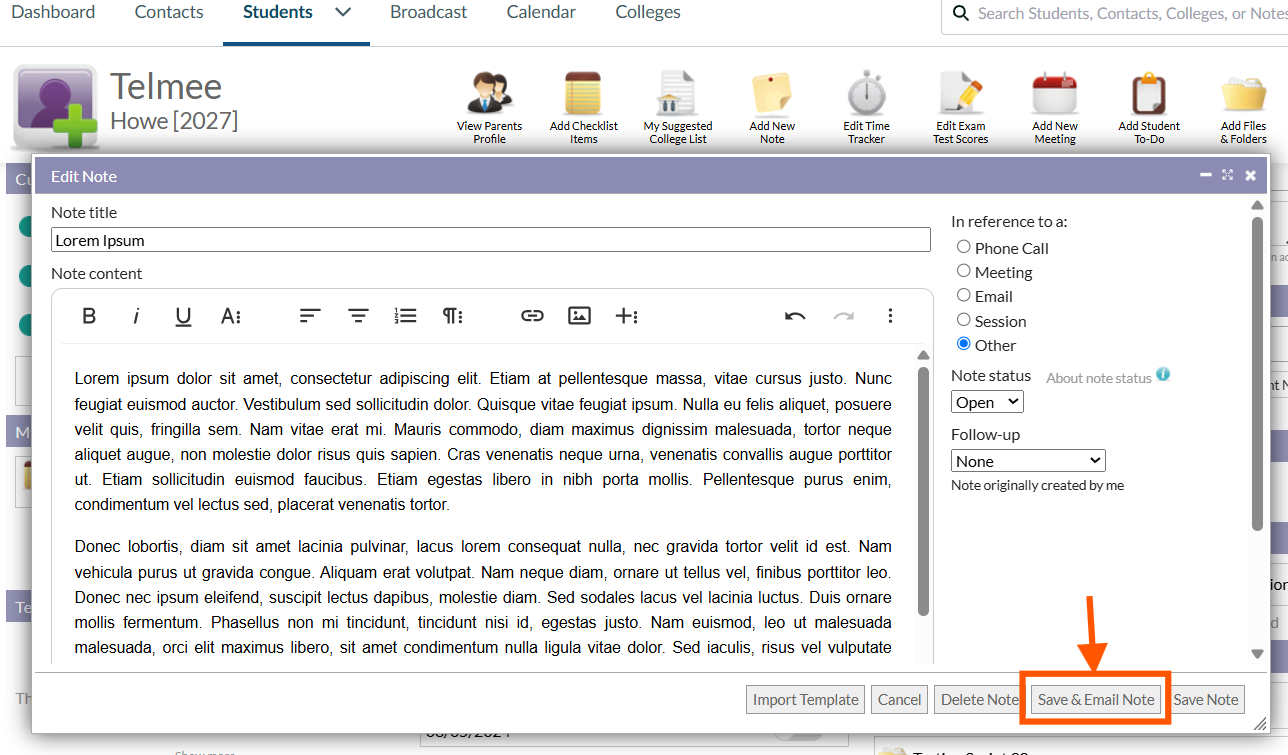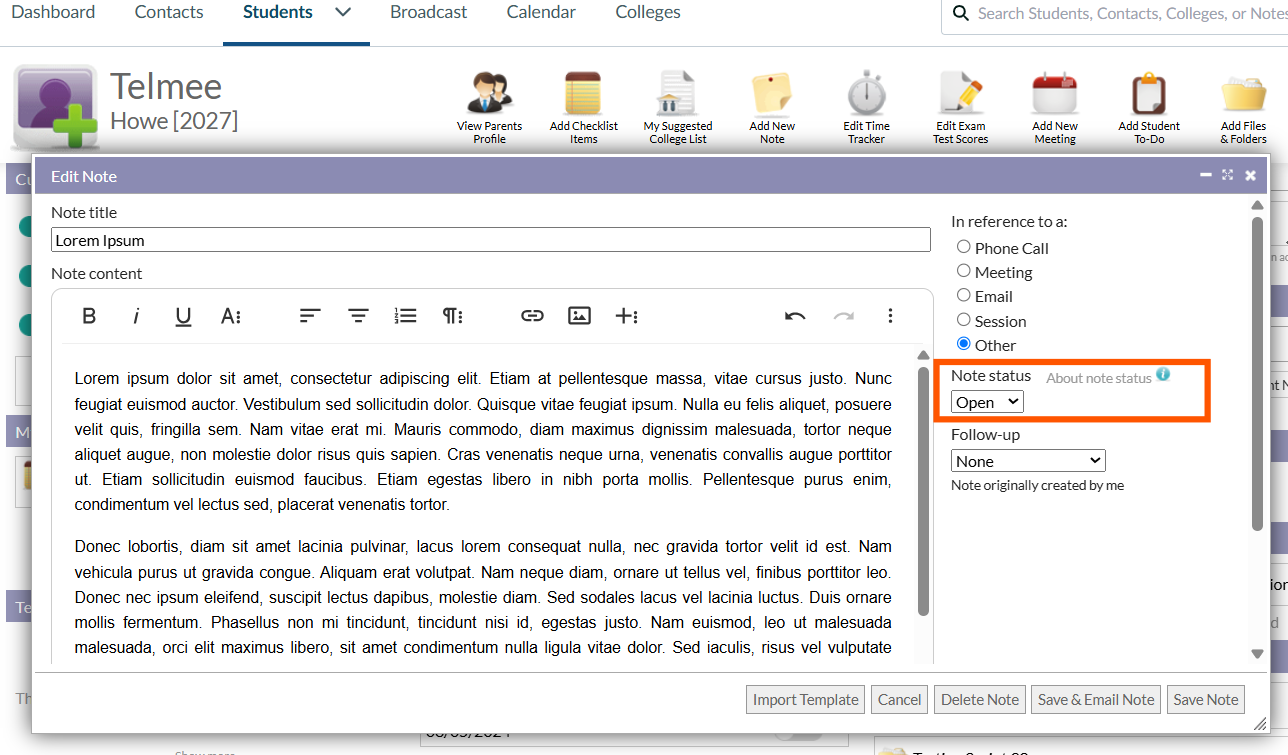 “Open” notes are designed to indicate there's a follow-up expected for a specific note. Perhaps a phone call is needed or another meeting needs to take place. By leaving a note “open”, the note will appear on your calendar, and alerts may be set up so as to let you know that further action is required. All “Open” notes will also appear on the Students Main page.