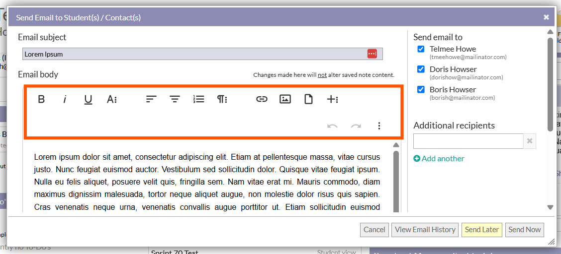 - The toolbar within the Email body provides several options so that you may customize your email.