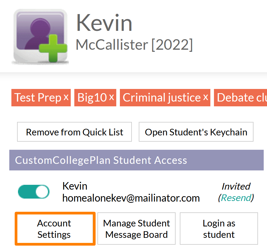 - Directly under the Student Picture/Icon, click the "Account settings" button in the "CustomCollegePlan Student/Parent Access"