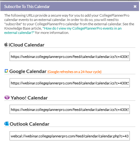 You can view your CollegePlannerPro calendar events in an external calendar like iCloud (Apple) Calendar, Google Calendar, Yahoo! Calendar or Outlook Calendar. In order to link the calendars, you will need to add a URL-based calendar "subscription" to your external calendar so it knows how to retrieve your CollegePlannerPro events. This is a two-step process.