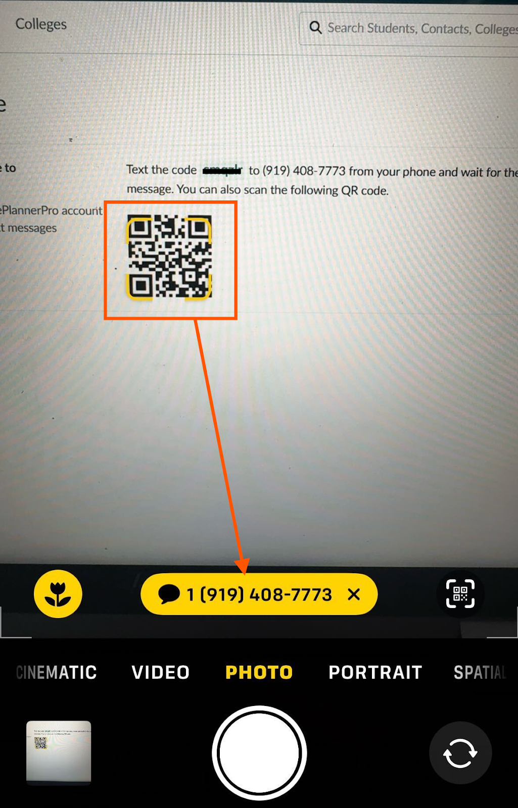 b. Alternatively, you may use your phone’s camera to scan the QR code and tap on the phone number that appears in yellow at the bottom of your screen (see image below) to have this part auto-filled for you.