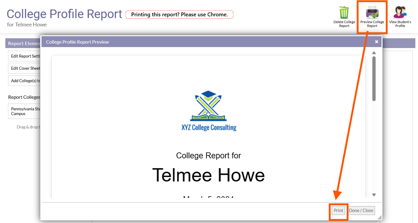 This article discusses how to make a PDF of your College Profile Report. You can then save the PDF and/or email the report to Students and Parents.