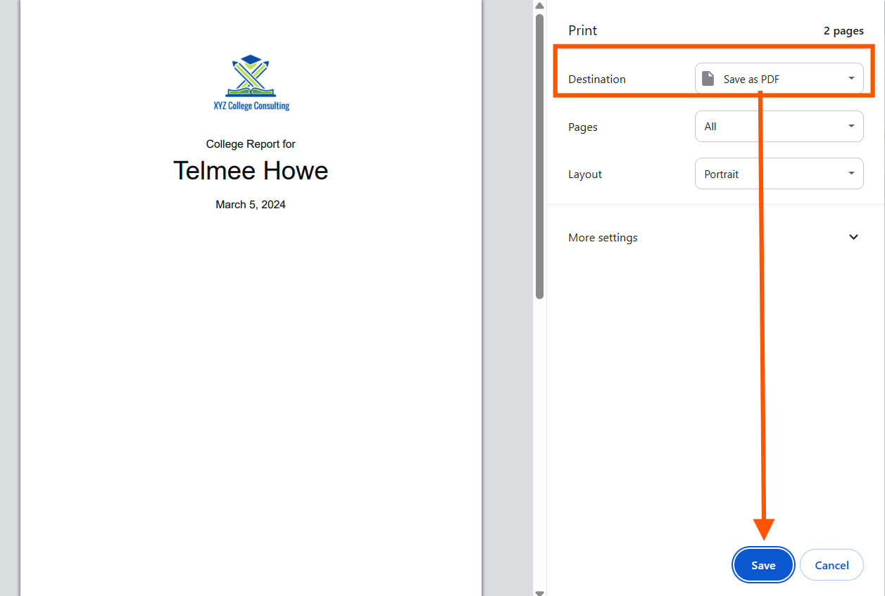 Important note: Each web browser and printer may use unique print dialog windows and PDF save options/terminology. Below are examples with screenshots based on different browsers.