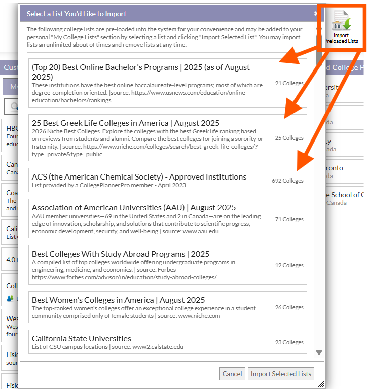From the resulting window, select a list to import from among the options. Once imported, you will see the list on the Colleges tab, in the center under "My Custom Lists". You can also search from within Dr. Antonoff's lists when building a Suggested List of colleges for your students.