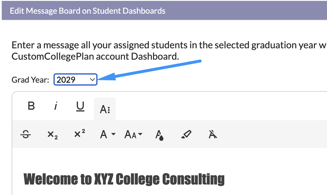 - To create a custom message for a specific graduation year - select the desired graduation year from the dropdown menu, craft your message, and save