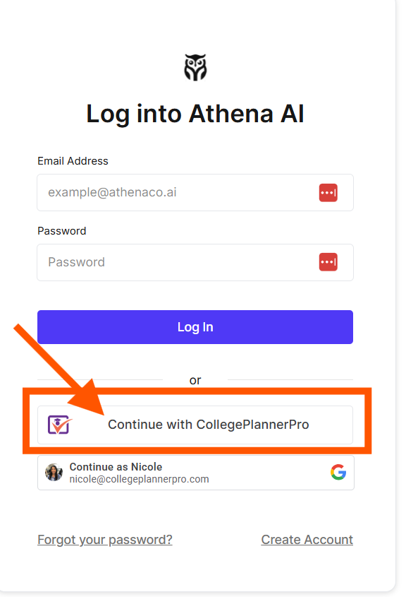 - Once you log into Athena AI from here, it will link your accounts. Going forward, connecting to Athena AI from CollegePlannerPro will not require a login.