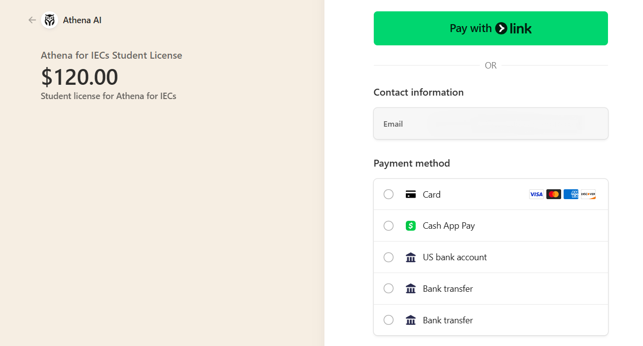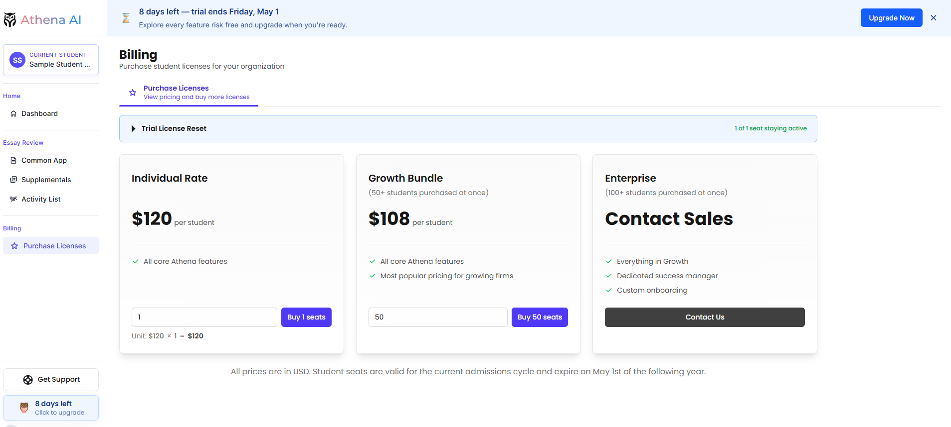 Athena AI uses an annual per-student license model. One license covers one student for a full application cycle and allows for unlimited essay reviews for that student. Student seats are valid for the current admissions cycle and expire on May 1st of the following year.